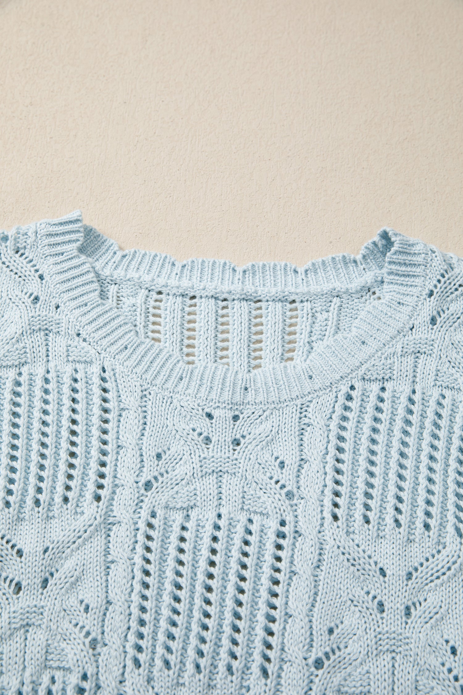 Beau Blue Pointelle Knit Patterned Scalloped Trim Short Sleeve Sweater