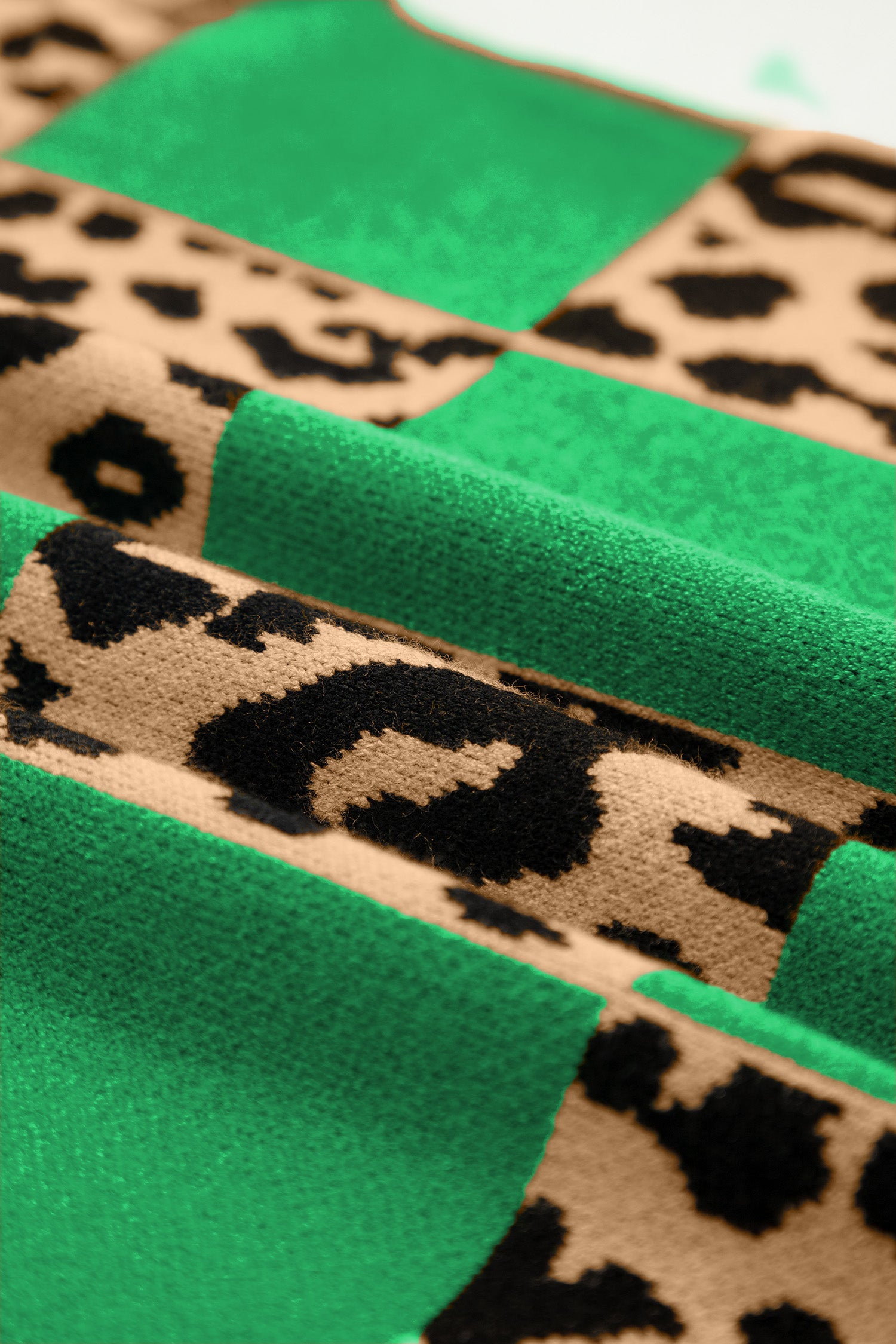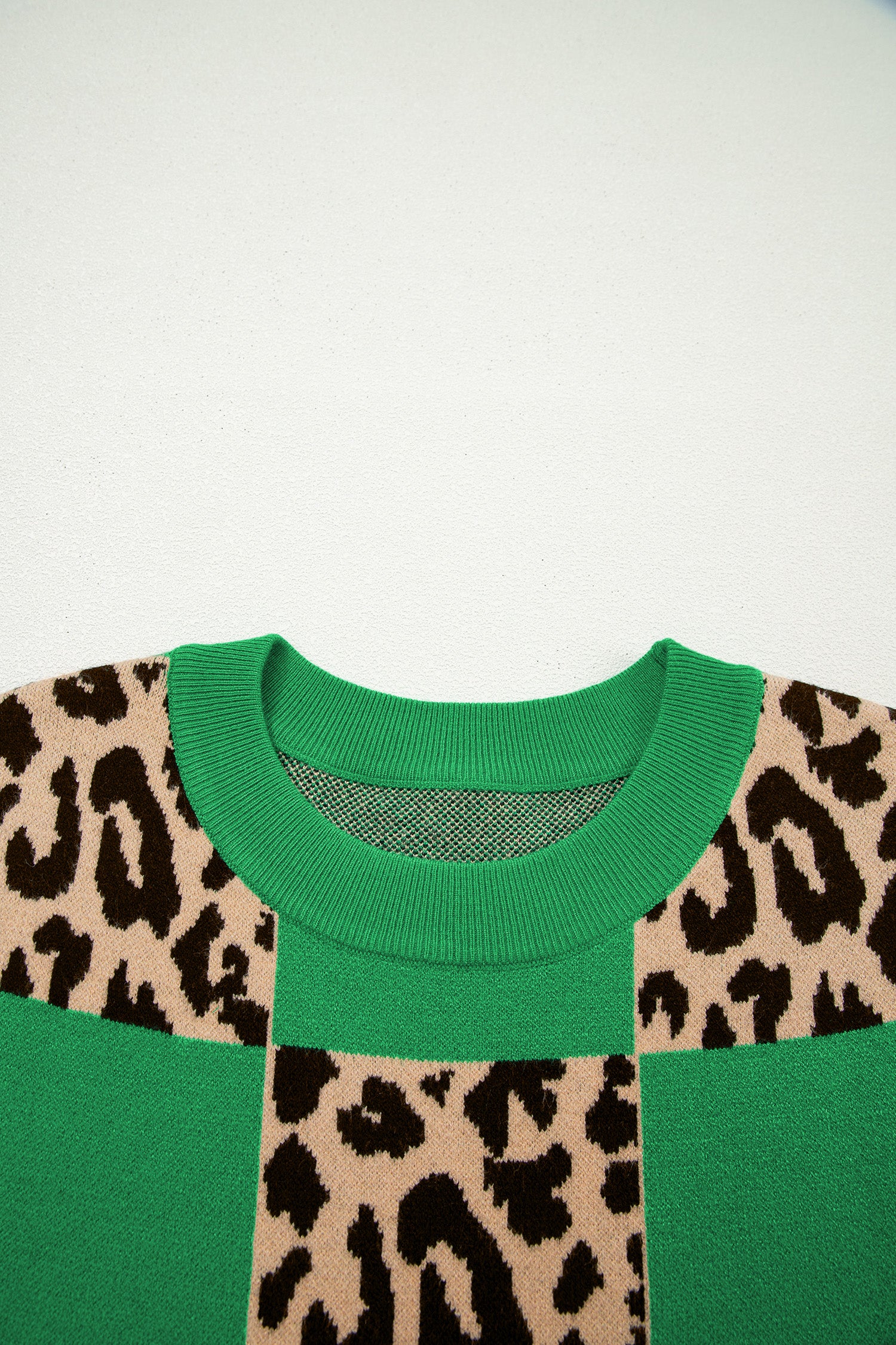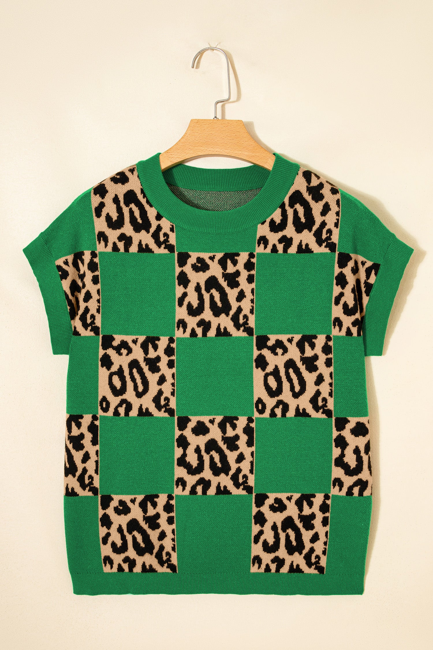 Green Leopard Checkerboard Short Sleeve Knit Sweater